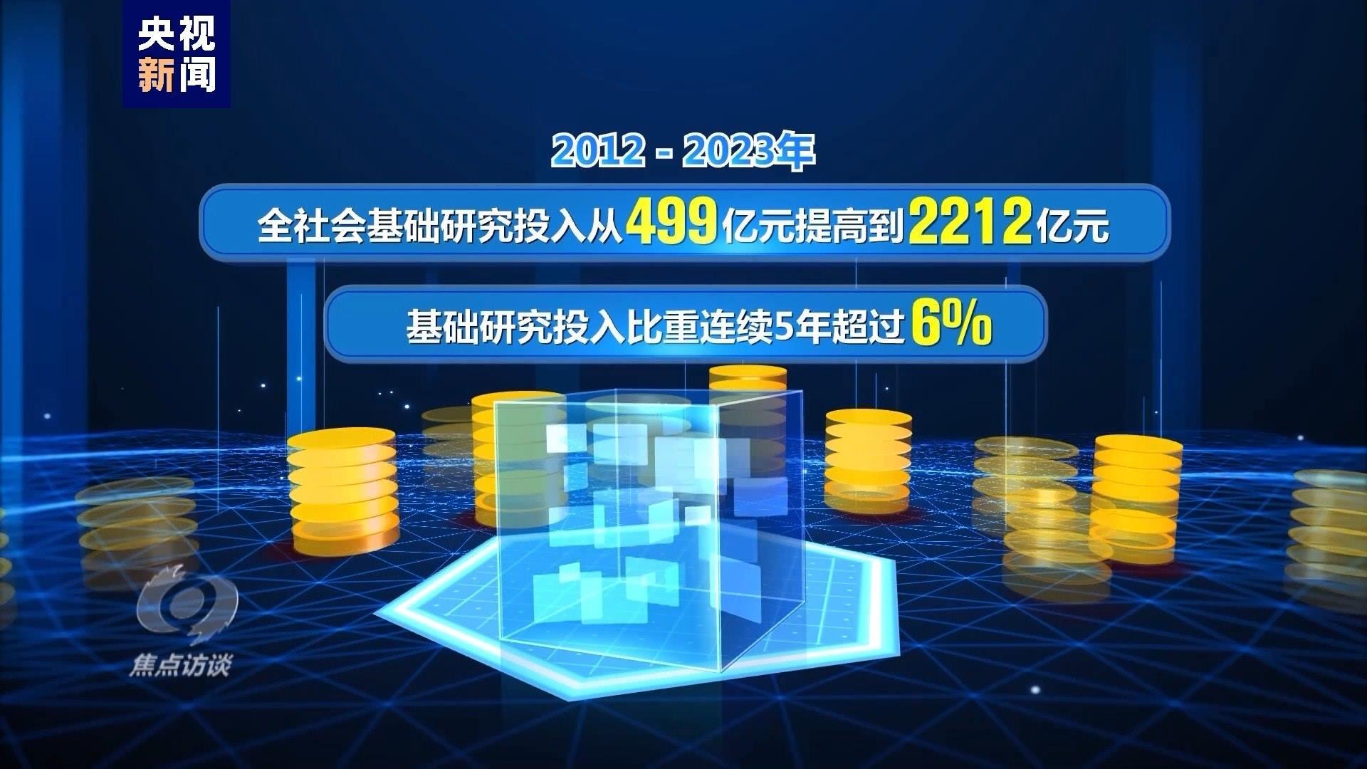2012—2023年,全社會基礎研究投入從499億元提高到2212億元,基礎研究投入比重連續(xù)5年超過6%。