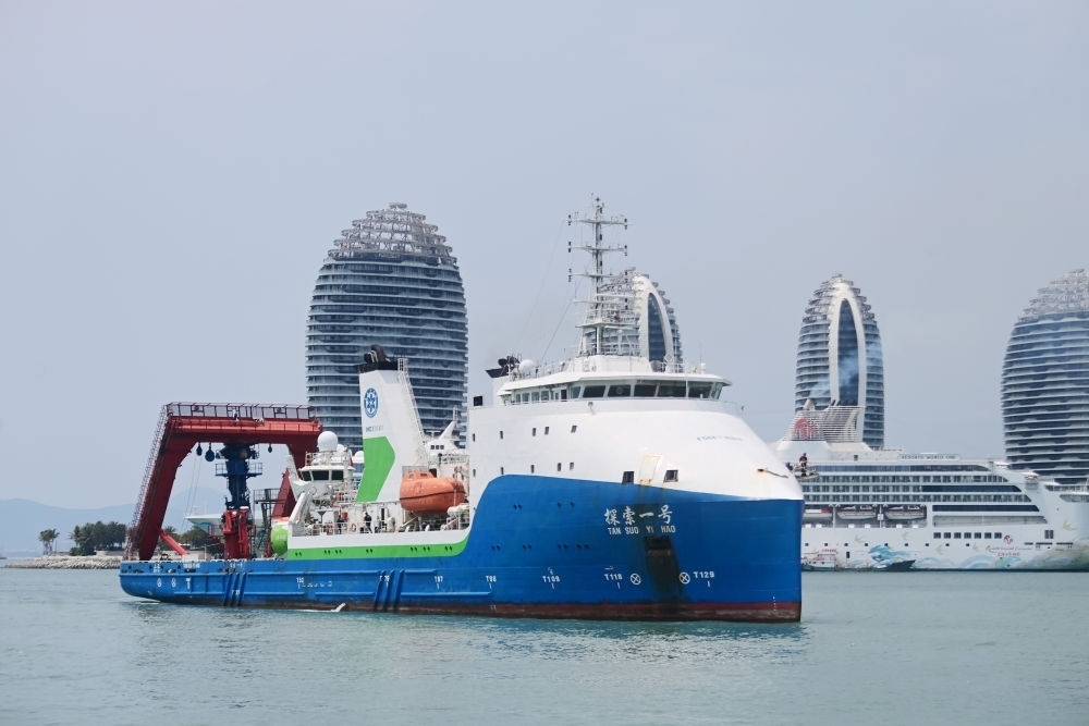 “探索一號”科考船搭載“奮斗者”號全海深載人潛水器返回海南三亞(2024年3月28日攝)。此次科考歷時50天,順利完成中國-印度尼西亞爪哇海溝聯(lián)合深潛任務。新華社發(fā)(沙曉峰 攝)