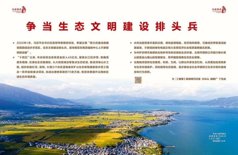 云南切實把生態(tài)文明建設(shè)擺在全局工作的突出位置,全面加強生態(tài)文明建設(shè),開啟美麗云南建設(shè)新征程。2022年5月,《云南省生態(tài)文明建設(shè)排頭兵規(guī)劃(2021—2025年)》發(fā)布,明確爭當全國生態(tài)文明建設(shè)排頭兵目標、主要任務(wù)和重大舉措,切實提升生態(tài)環(huán)境治理體系和治理能力現(xiàn)代化水平,全面形成綠色發(fā)展方式和生活方式。