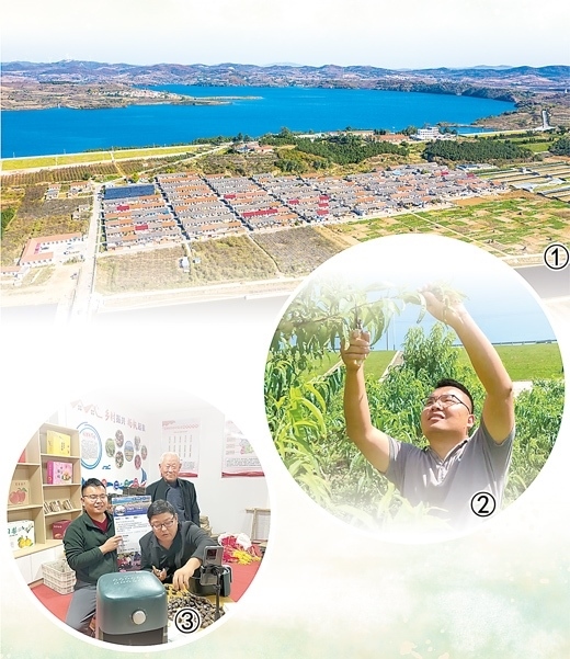 圖①:俯瞰龍角山村。許同惠攝 圖②:李家琦在幫村民修剪桃枝。本報記者 王 者攝 圖③:李家琦(左一)與村干部一起直播銷售農(nóng)產(chǎn)品。龍角山村村委會供圖