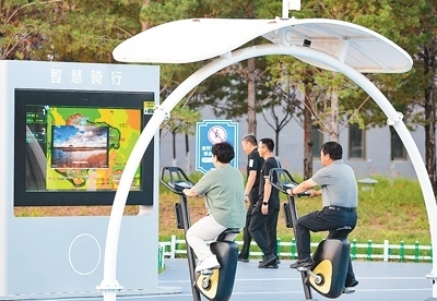 | 在內(nèi)蒙古自治區(qū)鄂爾多斯市康巴什區(qū)智慧體育公園,市民使用智慧騎行器械健身。王 正攝(人民視覺(jué)) |