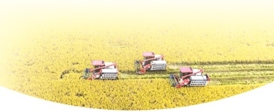 湖南省永州市東安縣蘆洪市鎮(zhèn)西江橋村優(yōu)質(zhì)稻產(chǎn)業(yè)化示范生產(chǎn)基地,專業(yè)收割機正在收割晚稻。蔡小平攝(人民視覺)