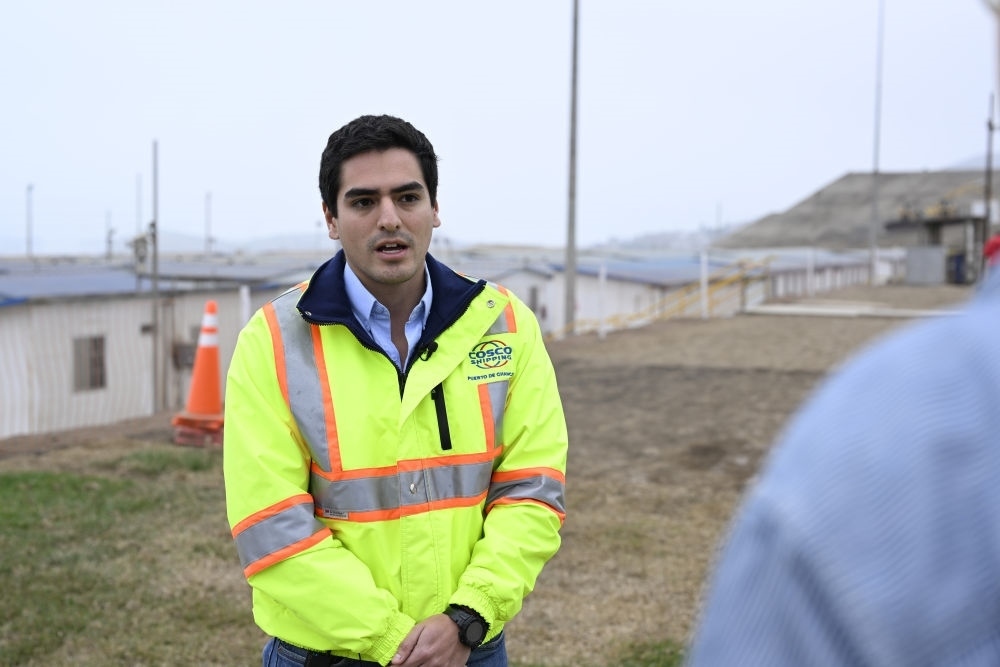 2024年6月21日,秘魯青年丹尼爾·哈雷斯在錢凱港項目現(xiàn)場接受媒體采訪。項目啟動之初,丹尼爾·哈雷斯還是一名剛入職場的實習生,如今27歲的他已成長為項目工程部合同管理員。隨著錢凱港建設不斷推進,項目的工作崗位在當?shù)爻蔀槟贻p人就業(yè)的熱門選項。