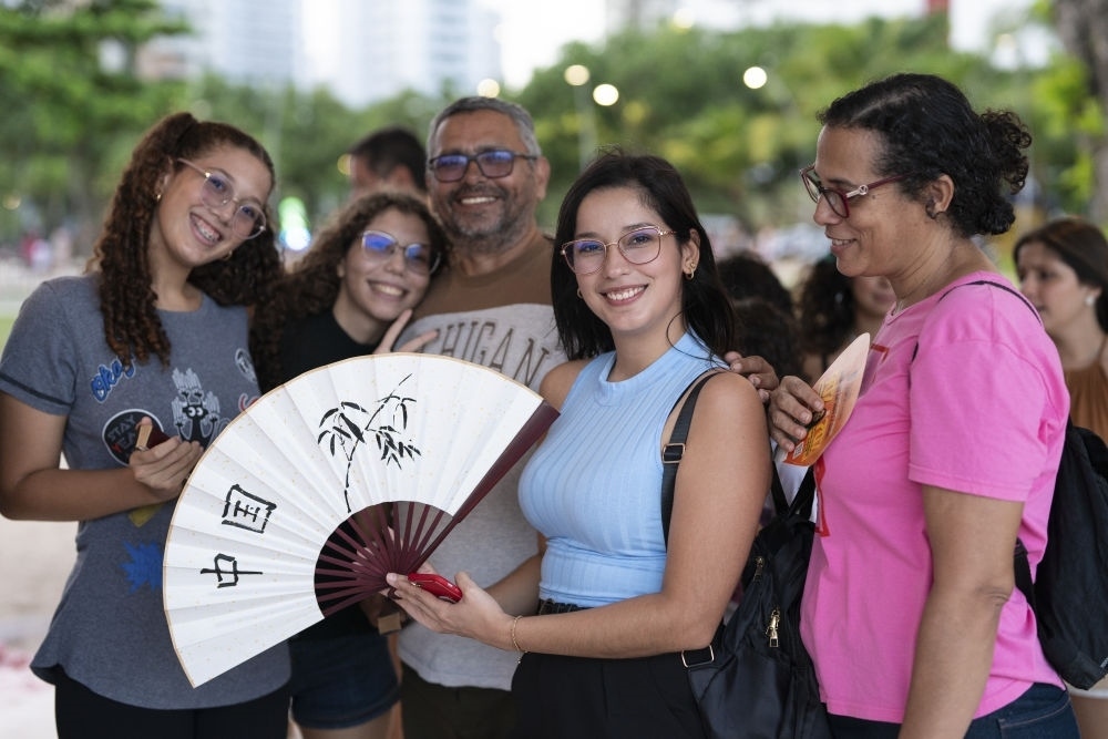 2024年2月3日,一名女子在巴西累西腓舉行的中國(guó)春節(jié)慶?;顒?dòng)上展示自己書(shū)寫(xiě)的扇面。
