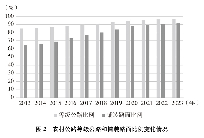 技術(shù)等級(jí)逐年提高。截至2023年底,農(nóng)村公路等級(jí)路②里程及比例分別達(dá)到445萬(wàn)公里和96.8%,鋪裝路面里程及比例分別達(dá)到422萬(wàn)公里和91.8%,十年間分別提高了11.9個(gè)百分點(diǎn)、27.2個(gè)百分點(diǎn)。