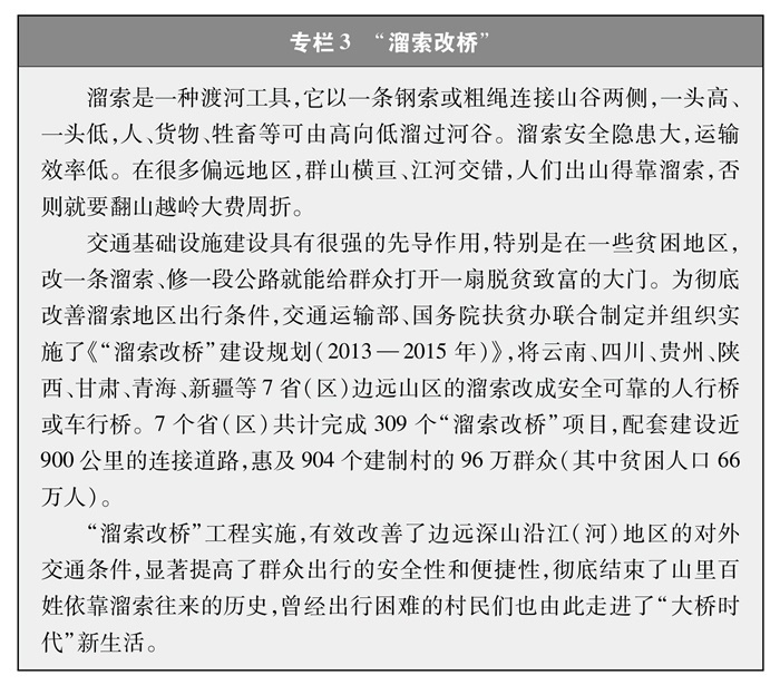解決特殊地區(qū)出行難題。改一條溜索、修一段公路就能給群眾打開(kāi)一扇脫貧致富的大門(mén)。為了保障偏遠(yuǎn)山區(qū)百姓安全出行,推動(dòng)“溜索改橋”建設(shè),專(zhuān)項(xiàng)資金支持、精心組織實(shí)施,用3年時(shí)間徹底改善了溜索地區(qū)出行條件(專(zhuān)欄3)。推進(jìn)“直過(guò)民族”③和人口較少民族聚居區(qū)農(nóng)村公路建設(shè),解決民族地區(qū)交通閉塞的突出問(wèn)題,加快民族地區(qū)脫貧致富步伐。