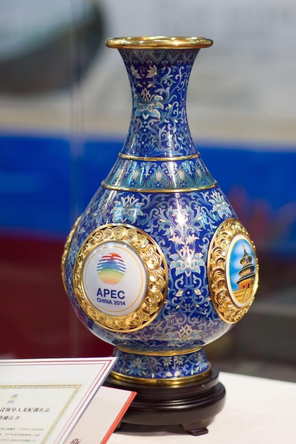 2014年11月,北京APEC會(huì)議在雁棲湖畔舉行。為歡迎參會(huì)的各經(jīng)濟(jì)體領(lǐng)導(dǎo)人,習(xí)近平主席選定了一件國(guó)禮——“四海升平”景泰藍(lán)賞瓶。賞瓶的細(xì)節(jié)蘊(yùn)含巧思:瓶高38厘米,是天壇祈年殿38米的等比例縮?。蛔畲笾睆?1厘米,代表APEC的21個(gè)經(jīng)濟(jì)體。碧藍(lán)的瓶身雕著水紋,既象征“四?!币泊憝h(huán)太平洋?!捌俊笔恰捌健钡闹C音,連起來(lái)即“四海升平”。
