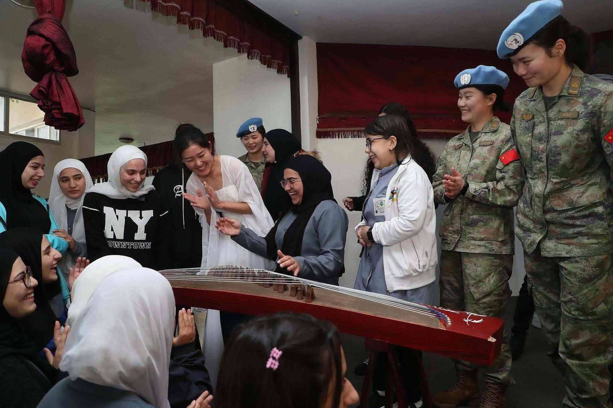 △2024年3月12日,中國(guó)第22批赴黎維和部隊(duì)官兵與黎巴嫩庫(kù)雷拉中學(xué)開(kāi)展文化交流活動(dòng)。