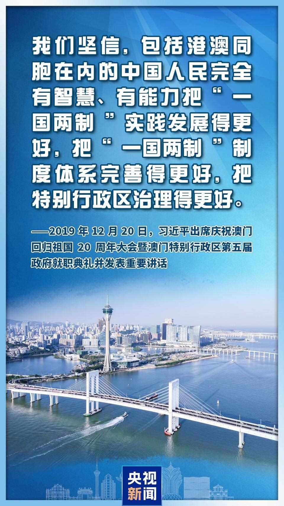 11月1日,在會(huì)見(jiàn)澳門特別行政區(qū)候任行政長(zhǎng)官岑浩輝時(shí),習(xí)近平主席指出,中央將繼續(xù)全面準(zhǔn)確、堅(jiān)定不移貫徹“一國(guó)兩制”、“澳人治澳”、高度自治的方針,確保不會(huì)變、不走樣。