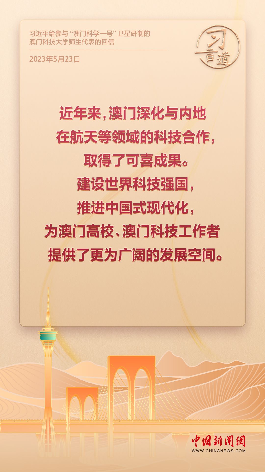 2024年是澳門回歸祖國25周年。多年來,習近平主席始終關注澳門經濟社會發(fā)展、百姓福祉,寄語“澳門的發(fā)展厚積薄發(fā)、未來可期”。