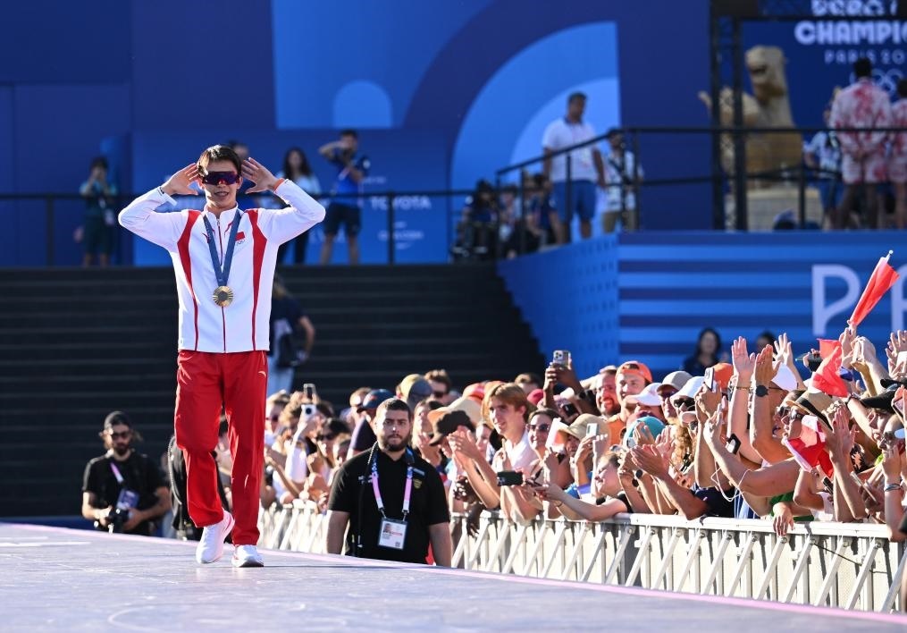巴黎奧運會跳水男子雙人三米板金牌得主、中國選手龍道一在法國巴黎冠軍公園與觀眾互動(2024年8月5日攝)。新華社記者 賀燦鈴 攝