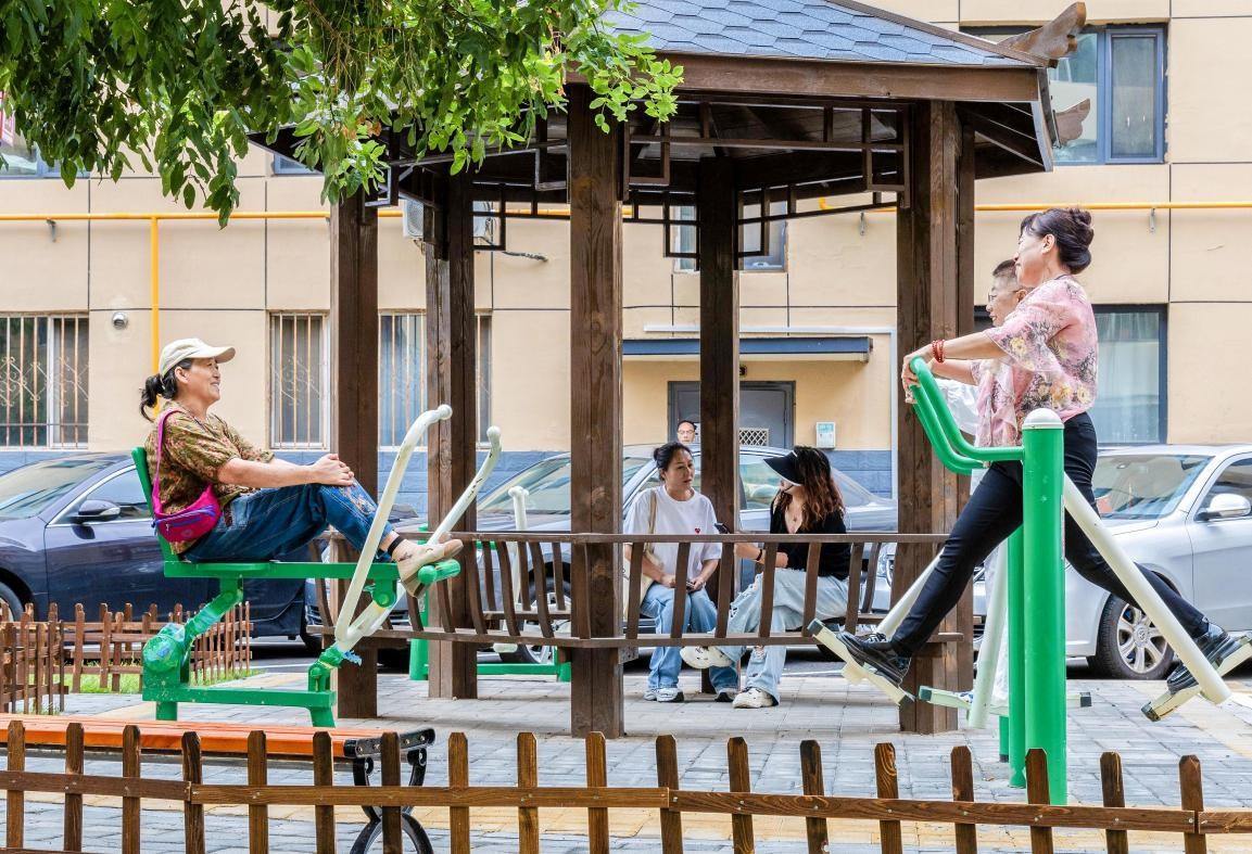 2024年8月26日,內(nèi)蒙古呼和浩特市玉泉區(qū)綠緣小區(qū),居民在改造后的運(yùn)動休閑區(qū)健身。