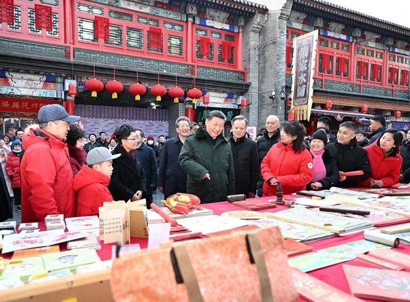 2024年春節(jié)前夕,總書記來(lái)到天津古文化街。在泥人張店鋪,他仔細(xì)觀看手藝人修復(fù)“孔子撫琴”的泥塑,感慨道:“一代代接續(xù)的工匠精神,讓文脈得以綿延不息。”在街邊的楊柳青木版年畫店鋪,他端詳“勾、刻、印、繪、裱”道道工藝,贊賞道“連年有余,寄托了人們對(duì)美好生活的向往”。