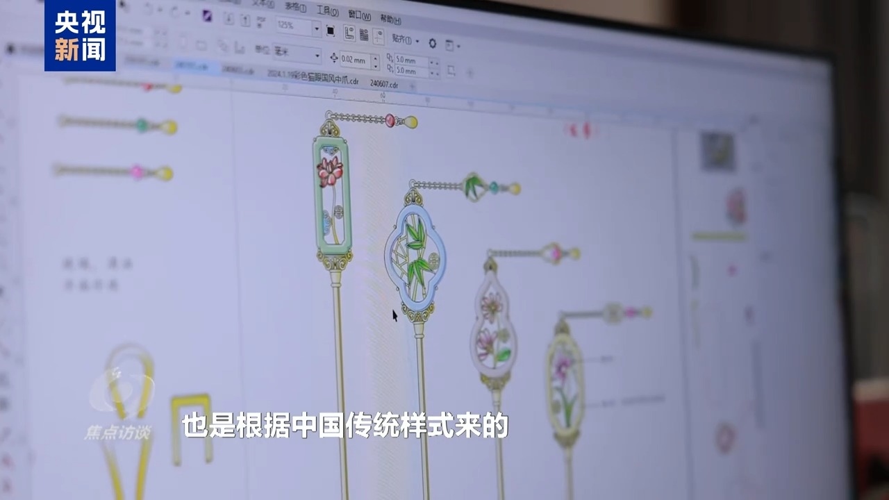 義烏某飾品公司產(chǎn)品設(shè)計師 周亮:梅蘭竹菊有傳統(tǒng)的一些寓意,然后這些圖案的外形,也是根據(jù)中國傳統(tǒng)樣式來的。材料方面,我主要是想體現(xiàn)中國的那種翡翠的感覺。