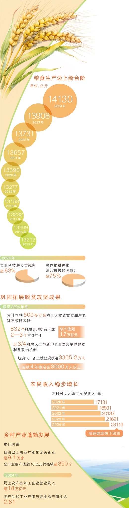 2024年,我國糧食產(chǎn)量首次超過1.4萬億斤,邁上歷史性新臺階。食用植物油自給率進一步提高,綠色優(yōu)質(zhì)農(nóng)產(chǎn)品供給持續(xù)增加。