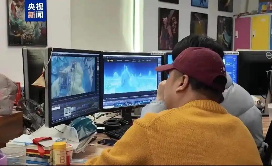 △《哪吒2》壯觀的特效背后,是全國138家動畫公司的合力托舉。圖為創(chuàng)作團(tuán)隊正在確認(rèn)畫面效果。