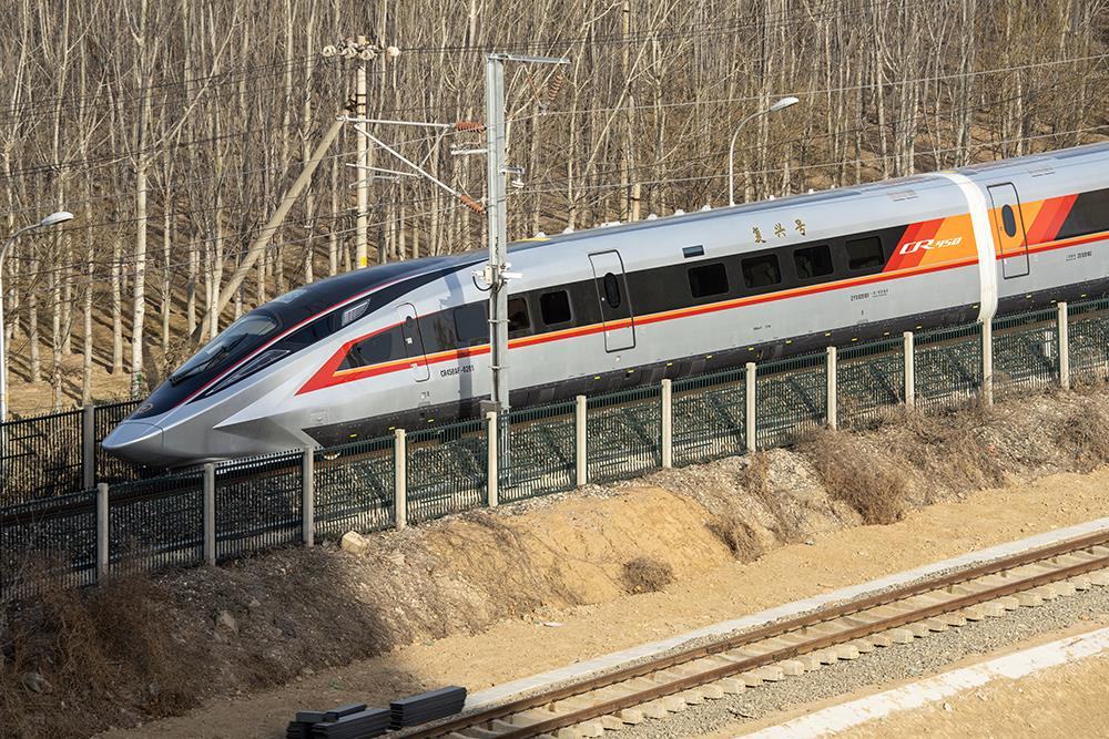 △2025年2月15日,中國鐵道科學(xué)院試驗中心環(huán)形試驗場,復(fù)興號CR450型電力動車組進場展開測試。