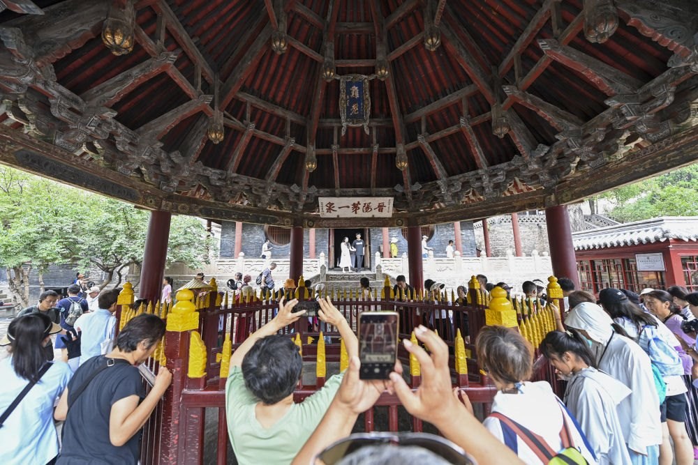 位于太原的晉祠,是祭祀西周初晉國首任諸侯唐叔虞的祠堂,是集中國古代祠祀建筑、園林、雕塑、壁畫、碑刻藝術(shù)于一體的珍貴的千年古祠,是首批全國重點(diǎn)文物保護(hù)單位之一。這是2024年7月25日,游客在晉祠博物館參觀。