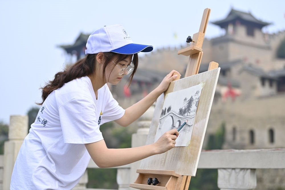 2024年7月10日,山西科技學(xué)院的學(xué)生在湘峪古堡寫生。
