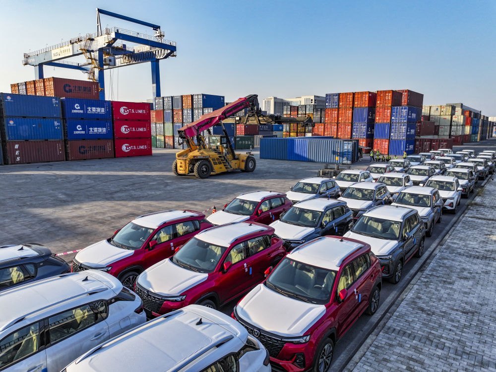 2024年10月28日在重慶國際物流樞紐園區(qū)西部陸海新通道重慶無水港拍攝的出口汽車裝運現(xiàn)場(無人機照片)。位于重慶市沙坪壩區(qū)的重慶國際物流樞紐園區(qū),是重慶中歐班列、西部陸海新通道班列、渝滿俄班列、渝甬班列的主要到發(fā)點,截至2024年10月,已開通班列線路62條,輻射125個國家和地區(qū)的542個港口。