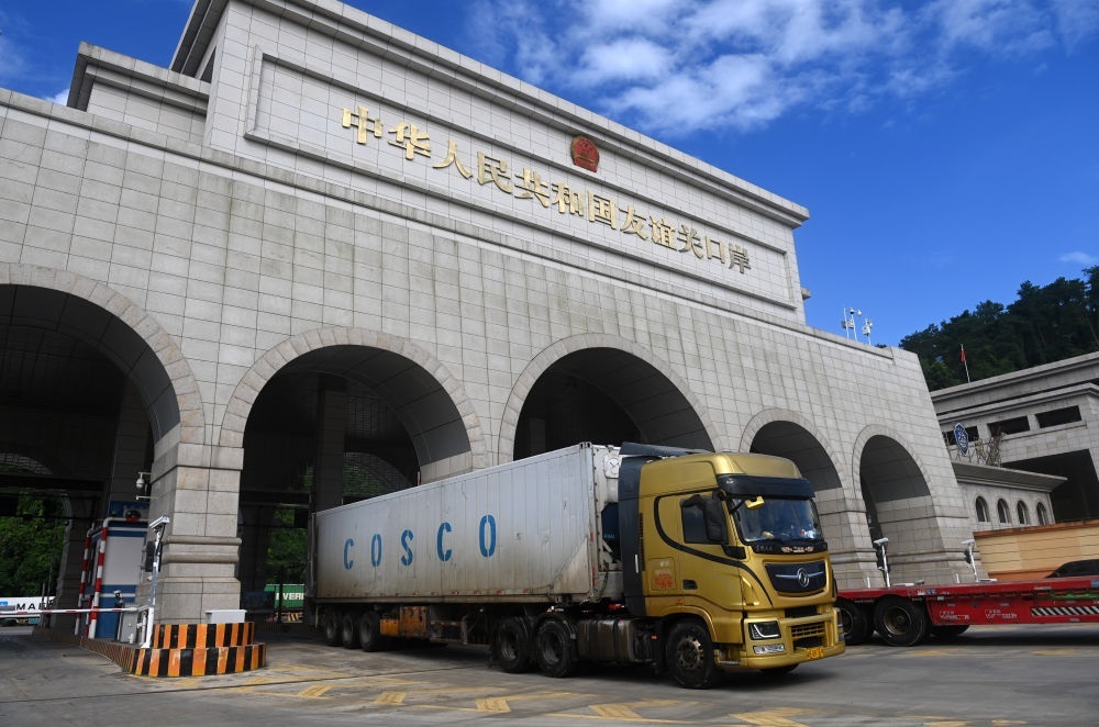 2024年8月26日,一輛貨車通過廣西憑祥友誼關口岸。友誼關口岸是西部陸海新通道的重要節(jié)點,是中國通往東盟最大的陸路口岸,也是我國通往越南最便捷的陸路大通道之一。滿載著東盟國家特色水果、農副產(chǎn)品與中國電子配件、大型設備等貨品的車輛在此“雙向奔赴”、川流不息。2024年,友誼關口岸年內出入境貨車數(shù)量首次突破50萬輛次,同比增長15.96%,創(chuàng)歷史新高。