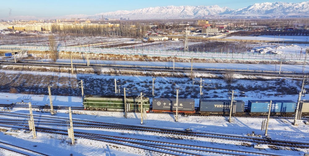 2024年12月25日,一列中歐班列經(jīng)霍爾果斯口岸駛向哈薩克斯坦(無人機照片)。霍爾果斯口岸地處伊犁哈薩克自治州、毗鄰哈薩克斯坦,是古絲綢之路北道上的千年驛站,也是近現(xiàn)代對外開放的百年口岸,更是我國面向中亞、西亞乃至歐洲的重要物流通道。2024年,該口岸中歐(中亞)班列開行量達8730列,同比增長12.5%;貨物過貨量達1208.4萬噸,同比增長10.9%;通行班列線路總數(shù)超過80條,輻射境外18個國家的46個城市。