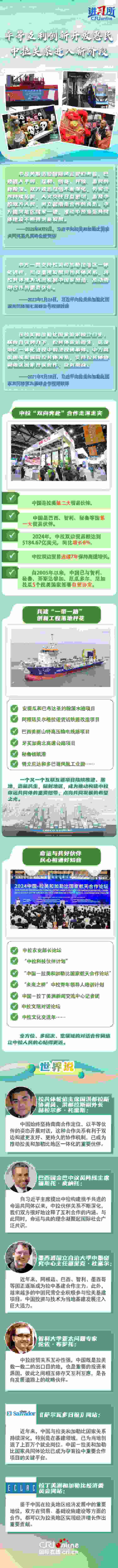 命運(yùn)與共,大道同行。2014年,習(xí)近平主席首次提出構(gòu)建中拉命運(yùn)共同體,為新時(shí)代中拉關(guān)系發(fā)展指明了方向,得到拉美和加勒比國(guó)家積極響應(yīng)。近年來,從就“引領(lǐng)中拉友好關(guān)系駛?cè)胄潞匠獭碧岢鼋ㄗh,到提出新時(shí)代中拉關(guān)系內(nèi)涵,習(xí)近平主席始終著眼于中國(guó)與拉美和加勒比國(guó)家命運(yùn)與共的未來,推動(dòng)中拉關(guān)系穩(wěn)步前進(jìn)。拉美地區(qū)媒體及政學(xué)界人士表示,中國(guó)始終堅(jiān)持南南合作定位,以中拉命運(yùn)共同體理念為指引,持續(xù)推動(dòng)雙邊關(guān)系升級(jí),已成為推動(dòng)拉美和加勒比地區(qū)一體化的重要伙伴。