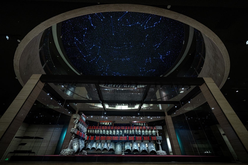 在湖北省博物館拍攝的隨州曾侯乙編鐘(2025年4月17日攝)。曾侯乙編鐘是我國出土數量最多、重量最重、音律最全、氣勢最為宏偉的一套編鐘,編鐘上的銘文是目前已知唯一的中國先秦官方音樂理論文獻,以聲音和文字相互印證的方式保存了2400多年前人類的音樂記憶。