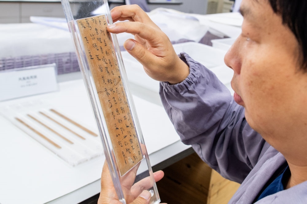 2023年5月20日,湖北荊州文物保護中心的修復人員史少華在查看修復完成的簡牘。荊州文物保護中心是我國簡牘修復領域實力最強的機構之一,近年來累計完成13萬多枚竹木簡牘的脫水工作,飽水簡牘修復量占全國90%以上。