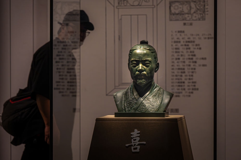 2024年4月30日,游客在湖北省博物館觀看云夢睡虎地秦簡主人“喜”的3D復原頭像。 當日,湖北省博物館策劃的專題展覽“惠此簡書——睡虎地秦墓出土簡牘”開幕,首次展出科技考古研究成果——“喜”的3D復原頭像。