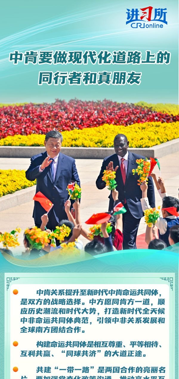 4月24日,中國國家主席習(xí)近平同肯尼亞總統(tǒng)魯托在北京舉行會談,兩國元首一致同意將雙邊關(guān)系定位提升至新時代中肯命運共同體。習(xí)近平表示,構(gòu)建命運共同體是相互尊重、平等相待、互利共贏、“同球共濟”的大道正途。中肯雙方要做現(xiàn)代化道路上的同行者和真朋友。