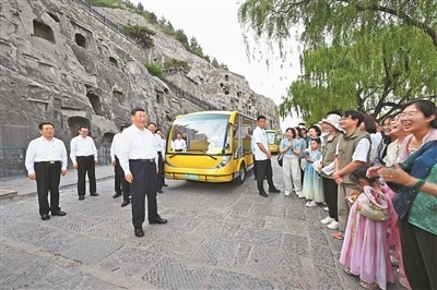 已有1500多年歷史的龍門石窟,是重要的世界文化遺產(chǎn)。習(xí)近平來到這里,察看石窟整體布局風(fēng)貌和代表性窟龕、造像,同現(xiàn)場的文物保護(hù)工作者親切交流。他強(qiáng)調(diào),要把這些中華文化瑰寶保護(hù)好、傳承好、傳播好。游客們見到總書記,都十分欣喜,紛紛向總書記問好。習(xí)近平不時同大家交流,特別鼓勵小朋友們多到實(shí)地尋溯中華文化,從小樹立文化自信。他指出,文旅融合前景廣闊,要推動文旅產(chǎn)業(yè)高質(zhì)量發(fā)展,真正打造成為支柱產(chǎn)業(yè)、民生產(chǎn)業(yè)、幸福產(chǎn)業(yè)。
