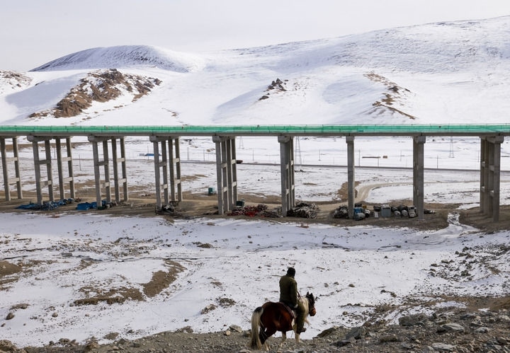 2024年12月30日,在新疆和靜縣,牧民騎馬從在建的新疆烏尉(烏魯木齊至尉犁)高速公路附近經(jīng)過。新華社記者 王菲 攝