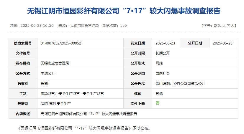 調查認定,無錫江陰市恒園彩纖有限公司“7·17”較大閃爆事故是一起因崗位員工盲目操作,生產單元安全設施缺失,現(xiàn)場應急處置不當,地方黨委、政府及其有關部門履職不到位而導致的較大生產安全責任事故。