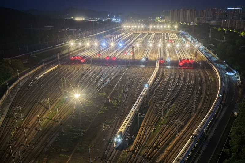 6月30日,動(dòng)車(chē)組列車(chē)駛出南京動(dòng)車(chē)段南京南動(dòng)車(chē)運(yùn)用所(無(wú)人機(jī)照片)。