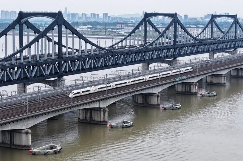6月30日,一列動(dòng)車(chē)組列車(chē)經(jīng)過(guò)武漢天興洲大橋延長(zhǎng)線(xiàn)(無(wú)人機(jī)照片)。
