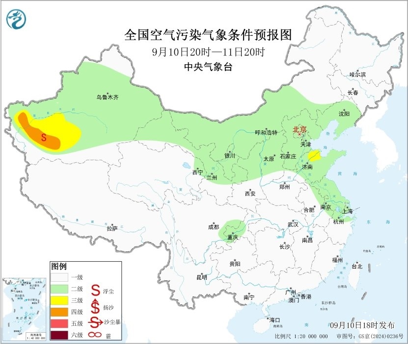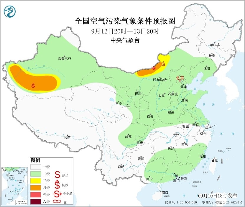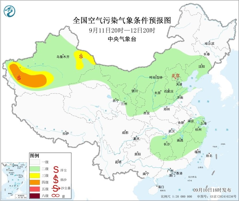 中新網(wǎng)9月10日電 據(jù)中央氣象臺網(wǎng)站消息,未來一周,全國大部地區(qū)大氣擴散條件較好,無明顯霾天氣。13日內(nèi)蒙古中部偏北部分地區(qū)有沙塵天氣。