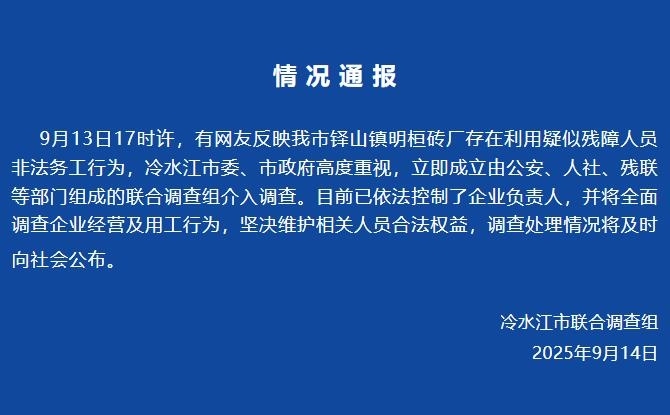 據(jù)“冷水江新聞”微信公眾號消息,9月13日17時許,有網(wǎng)友反映湖南冷水江市鐸山鎮(zhèn)明桓磚廠存在利用疑似殘障人員非法務工行為,冷水江市委、市政府高度重視,立即成立由公安、人社、殘聯(lián)等部門組成的聯(lián)合調(diào)查組介入調(diào)查。目前已依法控制了企業(yè)負責人,并將全面調(diào)查企業(yè)經(jīng)營及用工行為,堅決維護相關人員合法權益,調(diào)查處理情況將及時向社會公布。