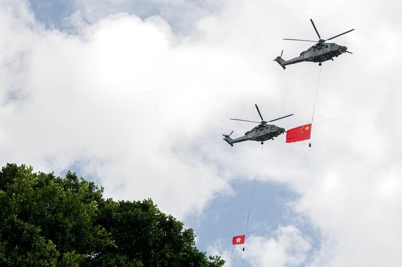 7月1日,香港特區(qū)政府在金紫荊廣場(chǎng)舉行升旗儀式,慶祝香港回歸祖國(guó)28周年。這是分別懸掛中華人民共和國(guó)國(guó)旗、香港特區(qū)區(qū)旗的直升機(jī)從空中飛過。