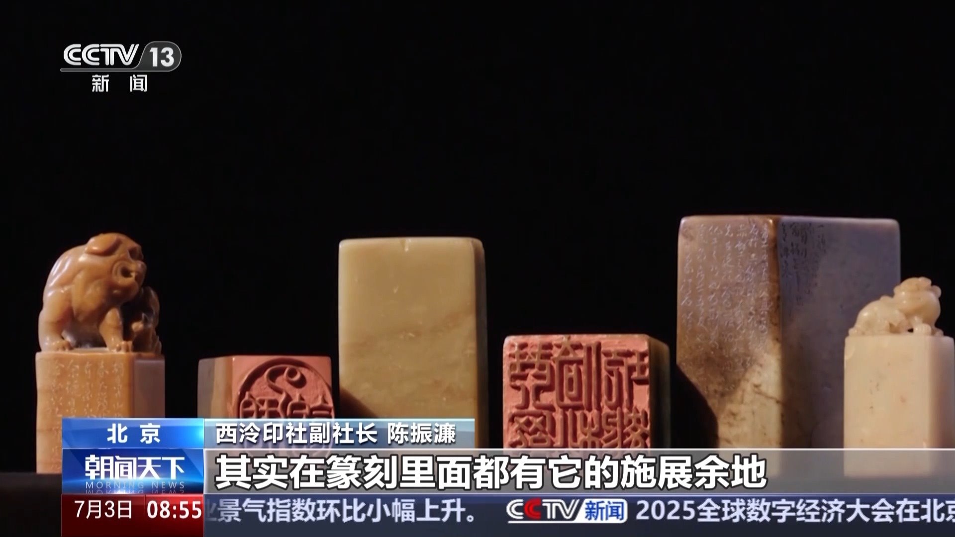 西泠印社副社長 陳振濂:或者是流暢的,或者是坎坷的,各種各樣的線條,其實在篆刻里面都有它的施展余地。一起一伏一頓一挫里面都是生命的脈動。