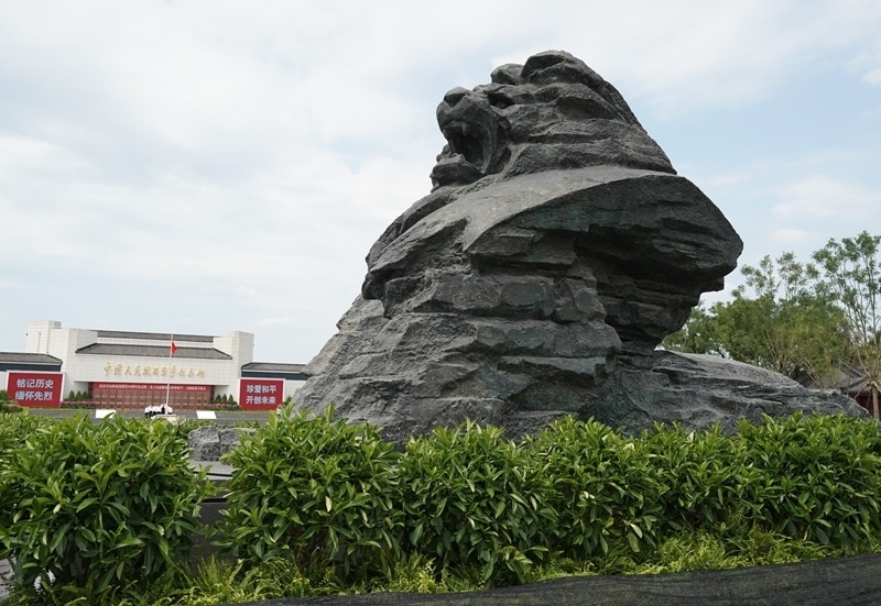 這是7月7日在中國人民抗日戰(zhàn)爭紀(jì)念館前拍攝的醒獅雕塑。