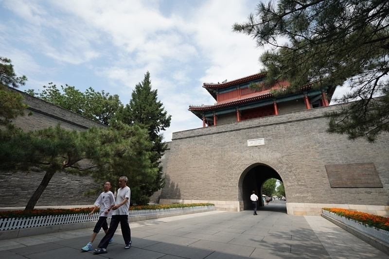 7月7日,人們從宛平城威嚴(yán)門前走過。