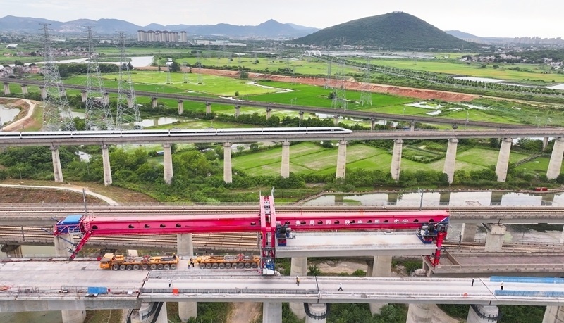 中鐵四局施工機(jī)械在巢馬城際鐵路最后一榀箱梁架設(shè)現(xiàn)場作業(yè)(7月8日攝,無人機(jī)照片)。
