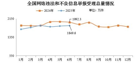 中新網7月9日電 據“中央網信辦舉報中心”微信公眾號消息,2025年6月,中央網信辦舉報中心指導全國各級網信舉報工作部門、主要網站平臺受理網民舉報色情、賭博、侵權、謠言等違法和不良信息1849.6萬件,環(huán)比增長1.1%、同比下降7.2%。其中,中央網信辦舉報中心受理舉報39.8萬件,環(huán)比下降9.5%、同比下降15.1%;各地網信舉報工作部門受理舉報63.7萬件,環(huán)比增長6.6%、同比下降50%;全國主要網站平臺受理舉報1746.1萬件,環(huán)比增長1.2%、同比下降4%。