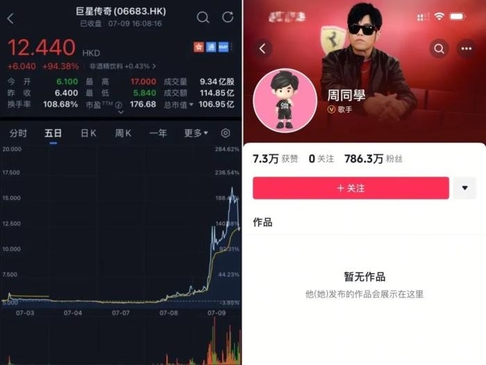 7月9日,周杰倫宣布入駐抖音平臺,賬號以其官方二次元IP形象“周同學(xué)”命名,頭像也是“周同學(xué)”IP化身,認(rèn)證身份為歌手。受該消息的提振,“周杰倫概念股”巨星傳奇(6683.HK)9日收漲94.37%,收盤價為12.44港元,總市值106.95億港元,單日成交量9.34億股,成交額達(dá)114.85億港元;盤中一度拉升漲165.62%,兩個交易日暴漲146.34%。