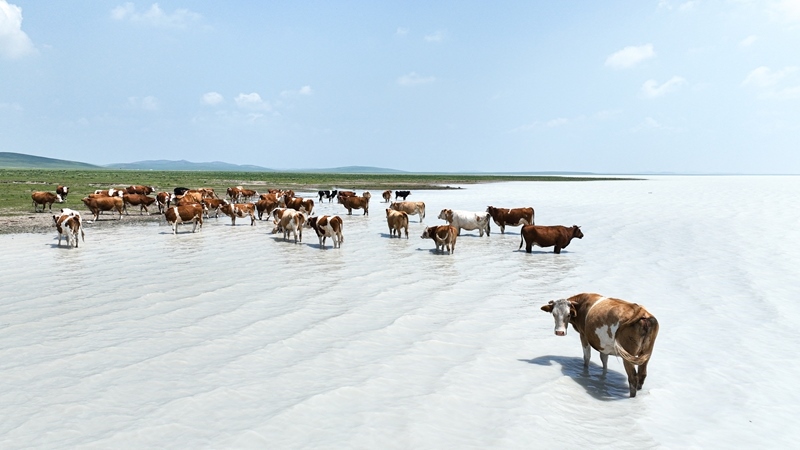 7月11日在內(nèi)蒙古錫林郭勒盟太仆寺旗拍攝的白音查干湖邊的牛群(無人機(jī)照片)。