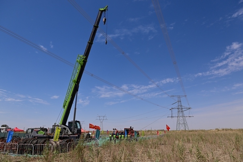 在民豐-且末750千伏線路,作業(yè)人員開展緊線作業(yè)(7月12日攝)。