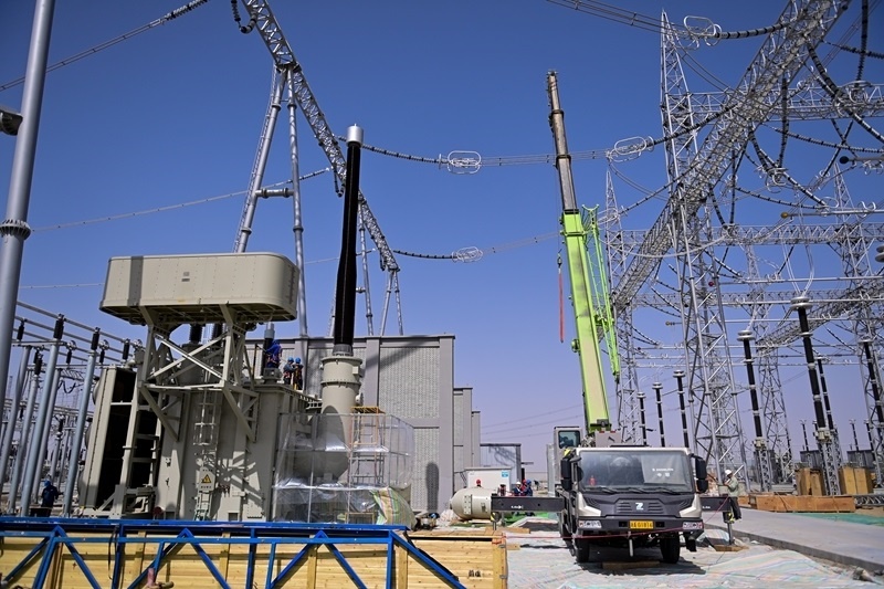 這是建設中的巴州-鐵干里克-若羌750千伏輸變電工程(2024年8月13日攝)。