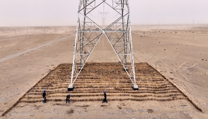 新疆和田地區(qū)于田縣,施工人員在線路塔基下鋪設草方格(4月24日攝)。