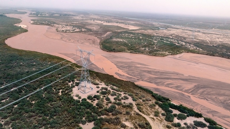新疆環(huán)塔里木盆地750千伏輸電線路跨越車爾臣河(6月14日攝)。